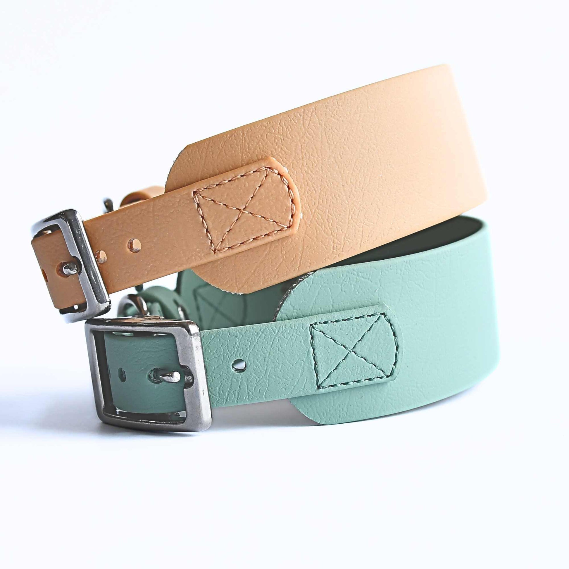 Das salbeifarbene Basisband ist 38 mm breit, die gleichfarbigen Befestigungsbänder sind mit strapazierfähigen Fäden vernäht, die Beschläge sind aus Edelstahl oder Messing. Das Halsband ist für Windhunde konzipiert, funktioniert aber auch gut bei größeren Hunden.